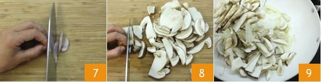 In the meantime, prepare the strudel filling: clean and peel the shallot, place it on a cutting board, and slice it finely 7. Now focus on cleaning and cutting the porcini mushrooms; to perform this operation correctly, consult the Cooking School guide: How to Clean Porcini Mushrooms. Once cleaned and washed, slice them 8. Afterward, pour a drizzle of oil into a non-stick pan and let the shallot brown, then add the porcini mushrooms 9.