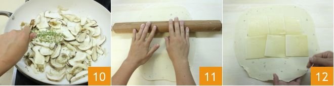 Finish by adding thyme leaves 10 and cook with the lid on for about 20 minutes, until the mushrooms are slightly wilted and browned. Turn off the heat and let them cool. Now take the shortcrust pastry out of the fridge, remove the plastic wrap, and start rolling it out with a rolling pin, trying to form a rectangle of about 16x20 inches with a thickness of 1/5 inch. Once the dough is rolled out, form a first layer of Emmentaler slices 12.