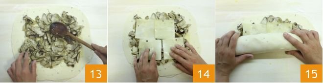 Pour the cooked porcini mushrooms over the cheese layer 13 and finish with another layer of Emmentaler slices 14. Then gently roll up the shortcrust pastry: take the pastry from one of the longer sides and fold it inward, being careful not to let the filling spill out 15, and seal the two ends like a package.