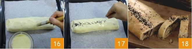Line a baking sheet with parchment paper and place the strudel with Emmentaler and porcini in the center, then beat an egg in a small bowl, add a tablespoon of milk, and, using a kitchen brush, glaze the surface of the strudel 16. Sprinkle with poppy seeds 17 and bake in a preheated static oven at 350°F for 45 minutes; if using a fan oven, bake at 320°F for 35-40 minutes. Once this time has passed, remove the strudel with Emmentaler and porcini from the oven and let it cool on a rack, then slice it 18 and serve it as an appetizer!