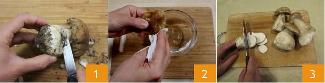 To prepare the porcini mushroom velouté, start by preparing the vegetable broth. In the meantime, focus on the cleaning of the porcini mushrooms: using a small knife, scrape off the soil attached to the mushroom 1. If there is a lot of soil, you might quickly rinse the mushrooms under a stream of cold water (this step is usually avoided to prevent them from absorbing water) 2. If the mushrooms have little soil attached, remove it gently with a brush. Then, with a very gentle twisting motion, separate the stem from the cap, slicing both into thin slices lengthwise 3. Once ready, set them aside.
