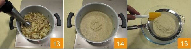 When the broth has been absorbed, use an immersion blender to blend the ingredients 13: you should obtain a homogeneous mixture 14 that you can collect in a bowl, straining it through a sieve to make it creamier 15.