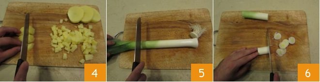 Proceed by washing and drying the vegetables. Take the potatoes, peel them, then dice them 4 and set them aside. Clean the leek by removing the tuft and the green part 5, then cut it into very thin slices 6.
