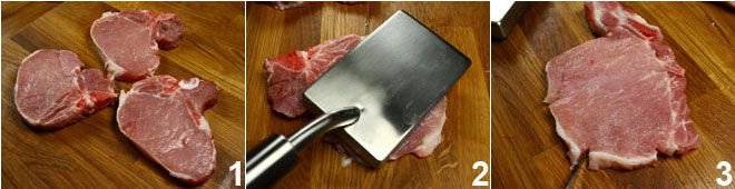Lightly pound the knots 1 with the meat mallet 2, then with a smooth-edged pointed knife (or kitchen scissors), make small cuts on the edges of each knot 3, so that during cooking the meat does not curl up;