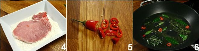 thoroughly coat the knots in flour 4, then shake them to remove the excess. Cut the chili pepper into rings 5 and place it in a rather large pan, along with the olive oil, bay leaf, sage, and rosemary, then sauté the ingredients 6.