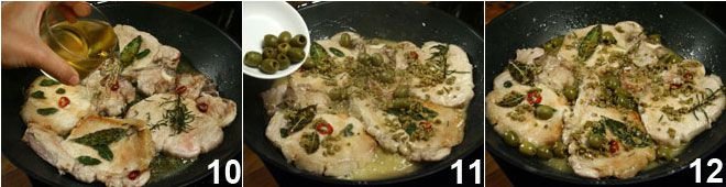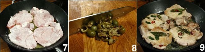 Add the floured knots to the pan 7 and let them brown on both sides. Meanwhile, finely chop half of the pitted olives 8, and when the knots are golden on both sides 9,