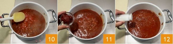 stir 10 and let it flavor for a few minutes. When the ragout has resumed boiling, add the tomato paste 11, mix it into the ragout, salt 12