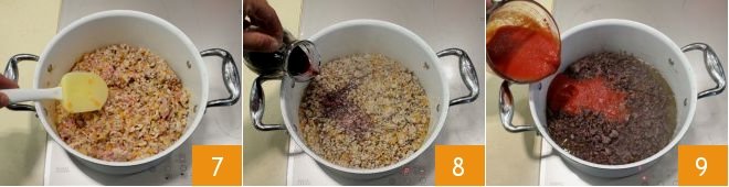 and let it brown well for about ten minutes, breaking it up with a spatula 7 or a wooden spoon. Add a little vegetable broth, then add the red wine 8 and let it evaporate over moderate heat. When the wine has evaporated, add the tomato puree 9,