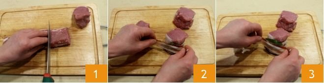 To prepare the pork medallion with Roquefort, start by cutting the loin into 4 fillets of about 7 oz each 1. Then wrap them with a slice of pancetta 2, press 2 sage leaves onto the sides of the fillet and cover with another slice of pancetta 3.