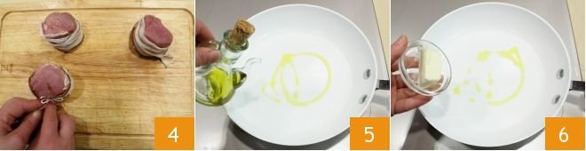 At this point, tie the fillets with kitchen twine to help them hold their shape during cooking 4. Now that the meat is ready, prepare the pan for cooking: pour a drizzle of oil 5 and add the butter 6 to melt it over low heat.