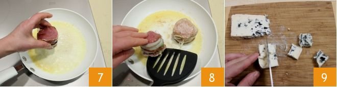 Place the pork fillets in the pan 7 and cook them over medium heat for about 4 to 6 minutes per side, depending on your preferred doneness (it's better not to cook them too long to avoid the meat becoming tough); during cooking, turn them to the other side as well 8. Meanwhile, cut the Roquefort cheese into pieces 9.