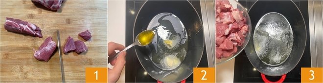 To prepare the pork stew, first cut the meat into 3-centimeter (about 1 3/16-inch) cubes 1. Heat a cast-iron pot (or alternatively a heavy-based casserole) with the butter and extra virgin olive oil 2. Once melted, add the meat cubes 3.