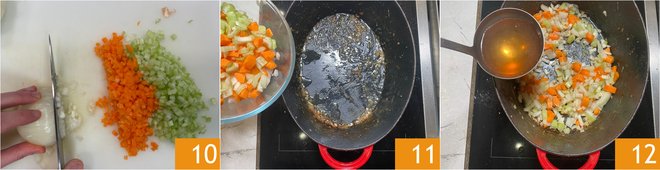 Now take care of the vegetables: chop the celery, carrot and onion 10. Put the chopped vegetables into the casserole with the cooking fond from the meat 11 and add a ladle of hot beef broth 12.