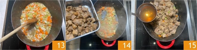 Stir to deglaze the bottom 13. After about 3 minutes, return the meat to the pot 14 and cover with hot broth 15.