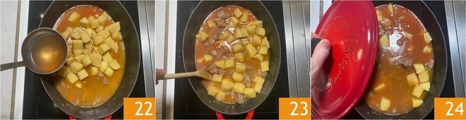 Add the remaining beef broth 22 and stir well with a spoon 23. Cover again with the lid and cook for another 40 minutes over medium-low heat 24.