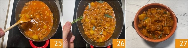 Aromatize with sage and rosemary tied together with kitchen twine 16, then cover with the lid, lower the heat and simmer gently for 60 minutes 17. In the meantime peel the potatoes and cut them into cubes the same size as the meat (about 1 3/16-inch) 18.