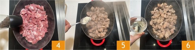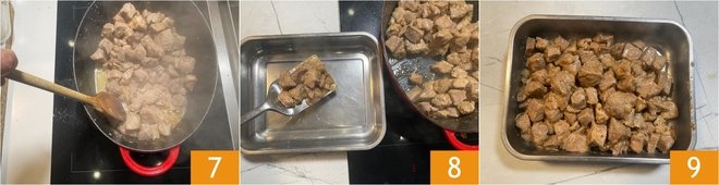 Mix well and let the alcohol aroma evaporate 7. At this point, remove the browned meat from the pot 8 and keep it warm in a baking dish 9.