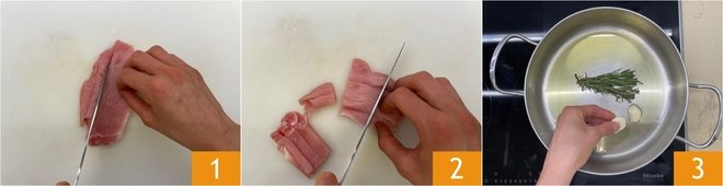 To prepare the pork strips with beer, start by cutting the loin into slices, then cut into strips 1 and continue to make strips 2. In a saucepan, pour the extra virgin olive oil, rosemary, and garlic 3. Let them infuse on low heat.