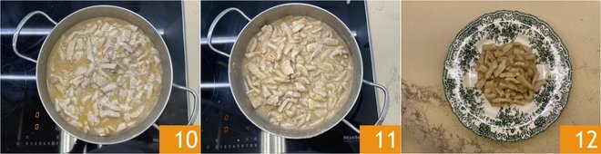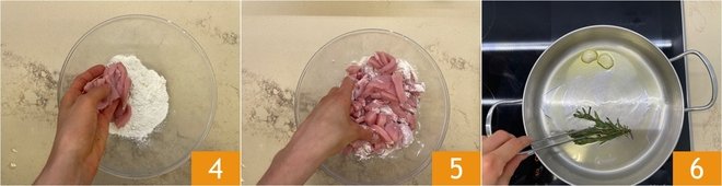Meanwhile, pour the flour into a bowl and add the pork strips 4, mix to coat them well in flour 5. At this point, remove the garlic and rosemary from the pot 6.