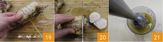 remove the netting created with the twine 19 and cut it into slices 20. In a high-sided container, pour the cooking juices with the vegetables and, using an immersion blender, reduce everything to a smooth sauce 21, if it turns out too liquid, thicken it on the stove, otherwise, you can thin it with some broth until you reach the desired consistency.