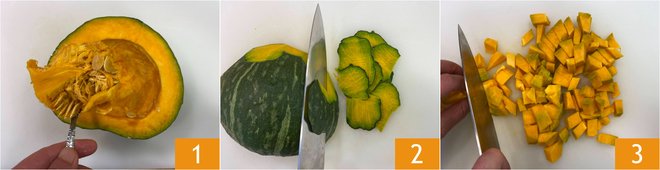 To prepare the pork tenderloin with pumpkin and figs, first take the pumpkin: remove the seeds, the internal fibers 1, and the peel 2. Then cut it into cubes 3.