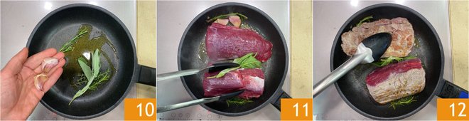 In a pan, pour a drizzle of oil, add the rosemary, sage, and unpeeled garlic 10. Add the tenderloin 11 and brown it for 3-4 minutes on each side 12.