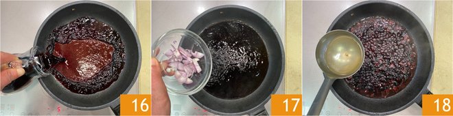 Meanwhile, in a pan, pour the Port wine 16, add the shallot 17 and the vegetable broth 18.