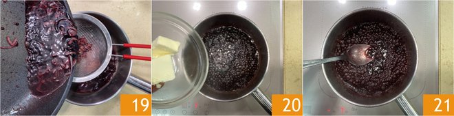 Cook until the liquid is reduced by half, then strain 19 into a small pot. Add the butter 20 and let it melt completely 21. Set aside.