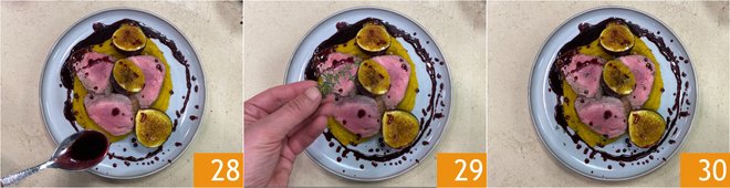 Add the figs and the Port wine sauce 28, finish with some rosemary 29. Your pork tenderloin with pumpkin and figs is ready to be served 30.