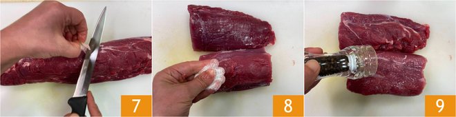 In the meantime, trim the excess fat from the tenderloin 7, cut it in half, and season with salt 8 and pepper 9.