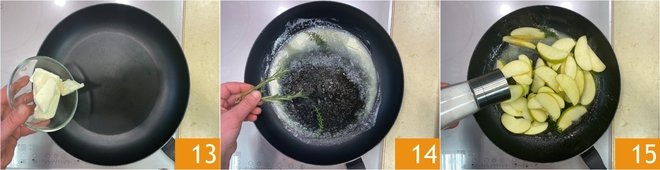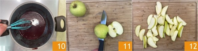 Use a whisk to mix and melt the butter well 10. Set the wine sauce aside and focus on the apples. Cut them in half and remove the core 11, then slice them into wedges without peeling 12.