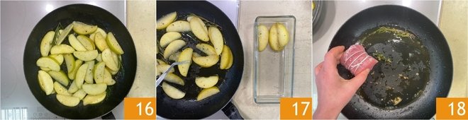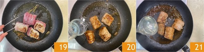 Avoid stirring but turn them with tongs 16. Once the apples are cooked, remove and keep them warm 17. In the same pan, place the tenderloins that you tied earlier 18.