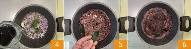 Pour the red wine 4 and add two bay leaves 5. Bring to a boil until it reduces, which will take about 10 minutes over medium-high heat 6.