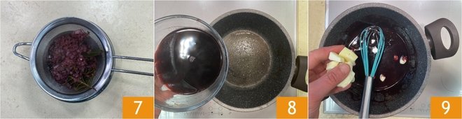 Strain with a sieve 7, pour the wine back into the same pot 8 and return to the heat until the sauce reduces again, about 10 minutes. Remove the pot from the heat and gradually add cold butter 9.