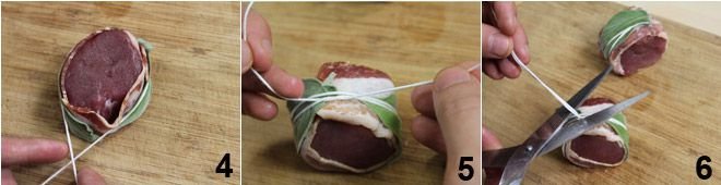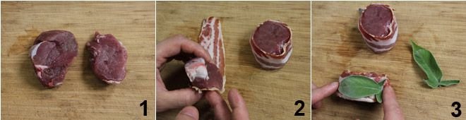 To prepare the pork tenderloins, start by wrapping the meat well with smoked bacon (1-2). Cover each tenderloin with two sage leaves 3, making them stick to the bacon slices.