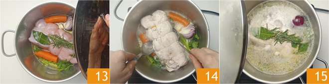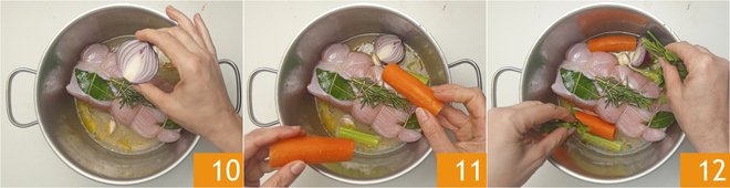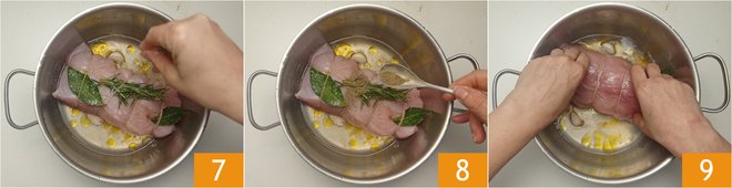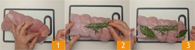 To prepare the pot-roasted turkey, first tightly tie the breast with kitchen string 1. Here you will find all the details of this procedure: how to tie a roast. Insert a sprig of rosemary 2 and two bay leaves 3, washed and dried. Place them in the ties.