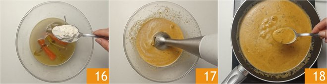 Remove the meat from the pot and transfer the cooking juices to a bowl, add the flour 16 and blend with an immersion blender 17. Pour the cooking juices into a pan and cook for a few minutes over low heat to thicken 18.