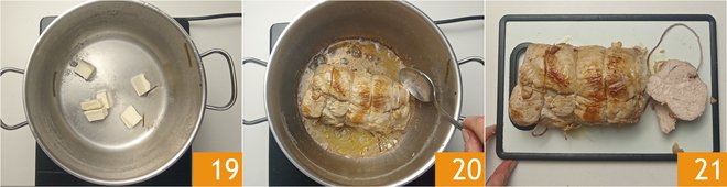 Put the butter in the pot 19, add the meat, and sear for two minutes on each side 20. Let it cool and remove the kitchen string before slicing 21. The pot-roasted turkey is now ready, serve it with the cooking juices.