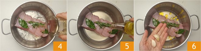 Transfer the meat to a pot, pour in the white wine 4, add the extra virgin olive oil 5, and two unpeeled garlic cloves 6.