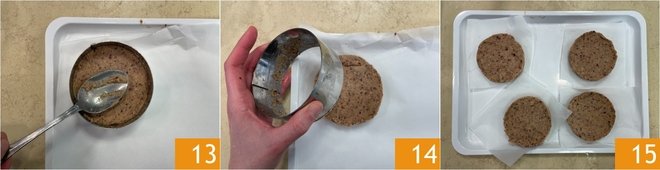 Compact it well with a moistened spoon 13 and remove the ring 14. If it's more convenient for you, cut the parchment paper around the burgers for cooking.