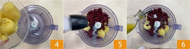 Place them in a blender 4 with drained canned red beans, salt 5, pepper, and extra virgin olive oil 6.