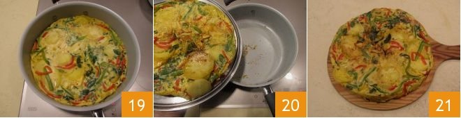mix everything with the whisk to combine the ingredients well 16. When the vegetables are ready, add the beaten eggs 17 and continue cooking for 10 minutes over low heat, covering with a lid 18.