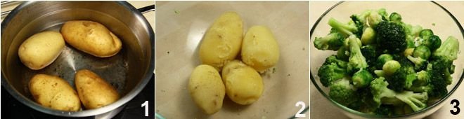 Wash the potatoes and, without peeling them, boil them whole by placing them in a pot covered with cold water 1. Once it reaches a boil, salt the water and let them boil for about 40 minutes, or until they are cooked. As soon as they are slightly cooled, peel the potatoes and place them in a large bowl 2. Also boil the broccoli; if using fresh broccoli, first rinse them under running water and trim them, then boil in salted water and drain them while still al dente 3.