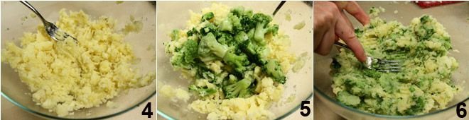 Then mash the potatoes with a fork. Add the well-dried broccoli to the bowl 5 and mash them as well 6.