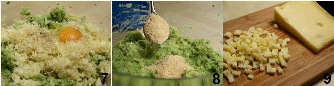 Once you have a fairly creamy mixture, add salt, white pepper, an egg, 100 grams (about 3.5 oz) of grated Emmental cheese 7, breadcrumb 8 (if the mixture turns out to be rather sticky, you can add another tablespoon of breadcrumb; otherwise, remove one), and the remaining Emmental cheese cut into small cubes 9.
