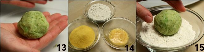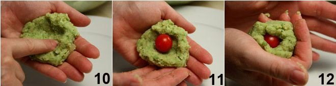 Mix everything by hand and let the mixture rest for 5 minutes: taste the mixture and adjust the salt if necessary. Take about 50-60 grams (about 1.75-2 oz) of the mixture 10, place a cherry tomato in the center 11, and cover it, forming a spherical croquette (12-13).