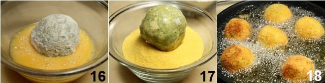 Then in the beaten egg 16 and finally in the corn flour 17. Place abundant peanut oil in a high-sided pan and heat it; when it is hot, immerse the croquettes 18 and let them brown, turning them with a pair of forks. Drain the now-golden croquettes and let them drip on a plate lined with kitchen paper. Serve the croquettes as soon as they are warm.