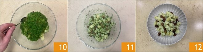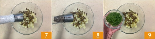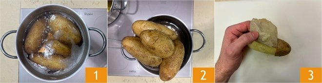 To prepare the potato and fennel salad, first, boil the potatoes starting in cold water 1: it will take about 30 minutes. As soon as they are soft, drain them 2 and let them cool, then peel them 3.