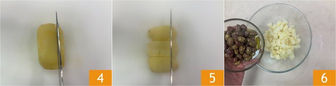Cut the potatoes first into thick slices 4 and then into chunks of about 1 inch 5. Gradually place them in a bowl. Add the pitted Taggiasca olives 6.