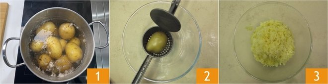 To make the potato and gorgonzola patties, first boil the potatoes with their skin starting from cold water for about 35 minutes from the boil 1. Once cooked, mash them in a bowl with a potato masher 2. Let the mashed potatoes cool for about 15 minutes 3.